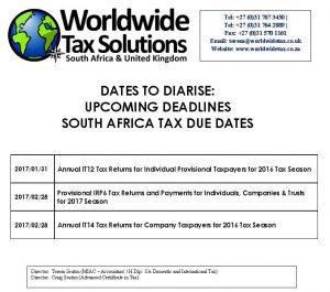 24/01/2017 | WWTS | 0 Comments | Social Media Newsletters Dates to diarise for upcomming deadlines. South-African Tax due dates