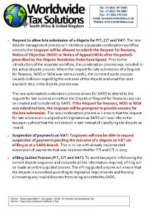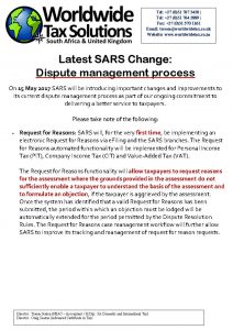 10/05/2017 | WWTS | 0 Comments | Tax Law Newsletters WORLDWIDE TAX SOLUTIONS NEWSLETTER 22 (10 MAY 2017) DISPUTE MANAGEMENT PROCESS