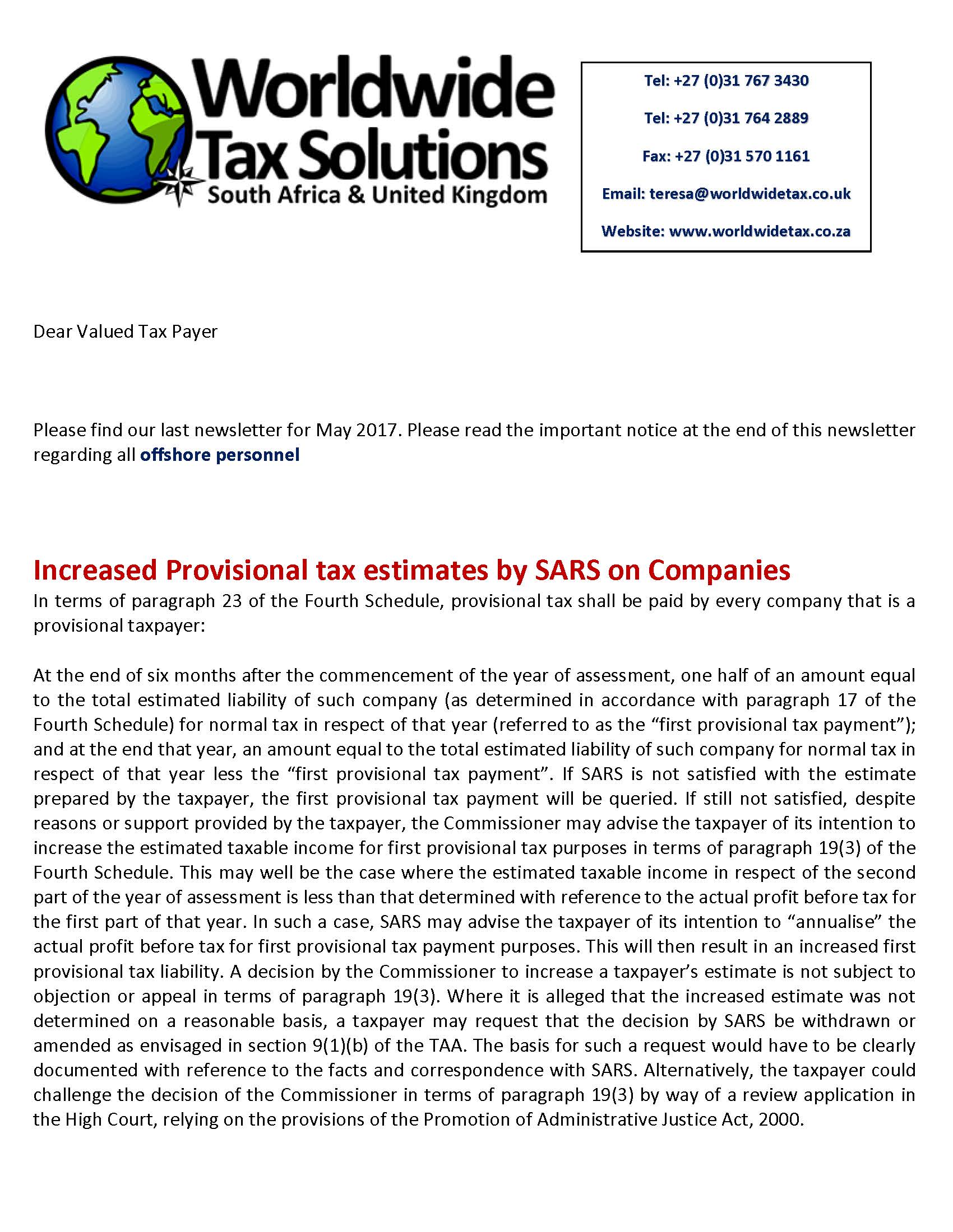 15/05/2017 | WWTS | 0 Comments | Tax Law Newsletters WORLDWIDE TAX SOLUTIONS NEWSLETTER 23 (15 MAY 2017) – RENTAL INCOME IN RSA