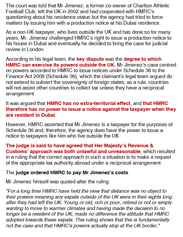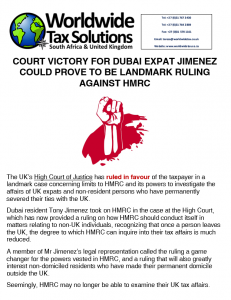 27/11/2017 | WWTS | 0 Comments | Tax Law Newsletters COURT VICTORY FOR DUBAI EXPAT JIMENEZ COULD PROVE TO BE LANDMARK RULING AGAINST HMRC (Newsletter 38)