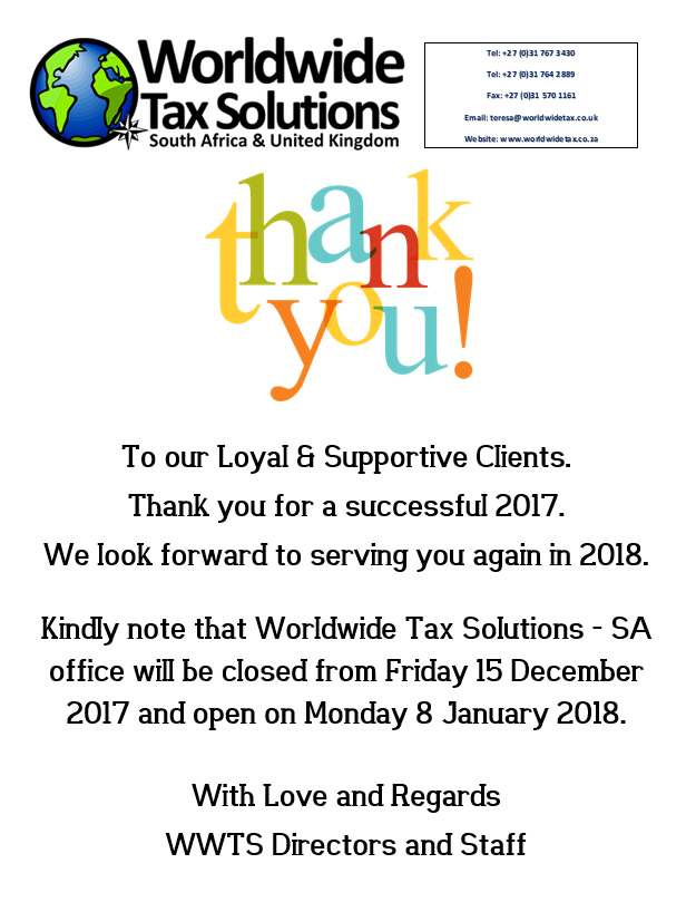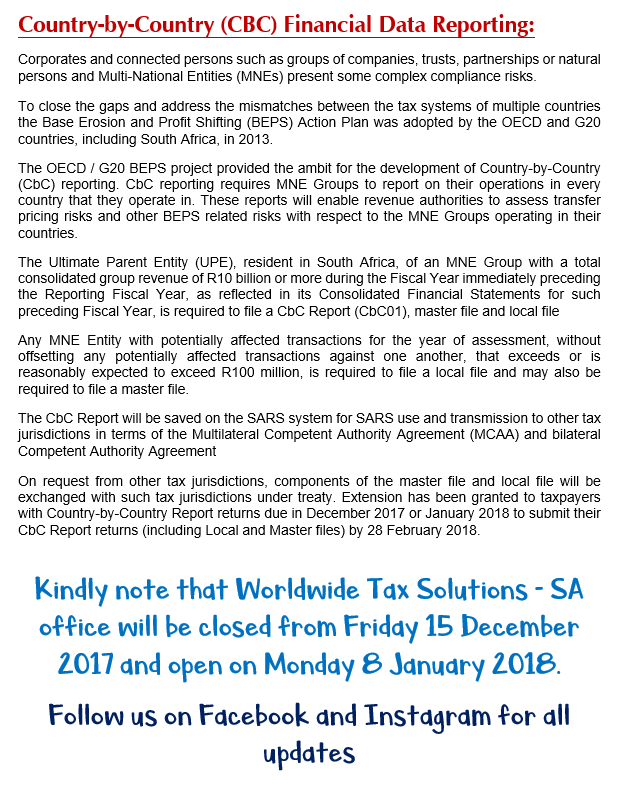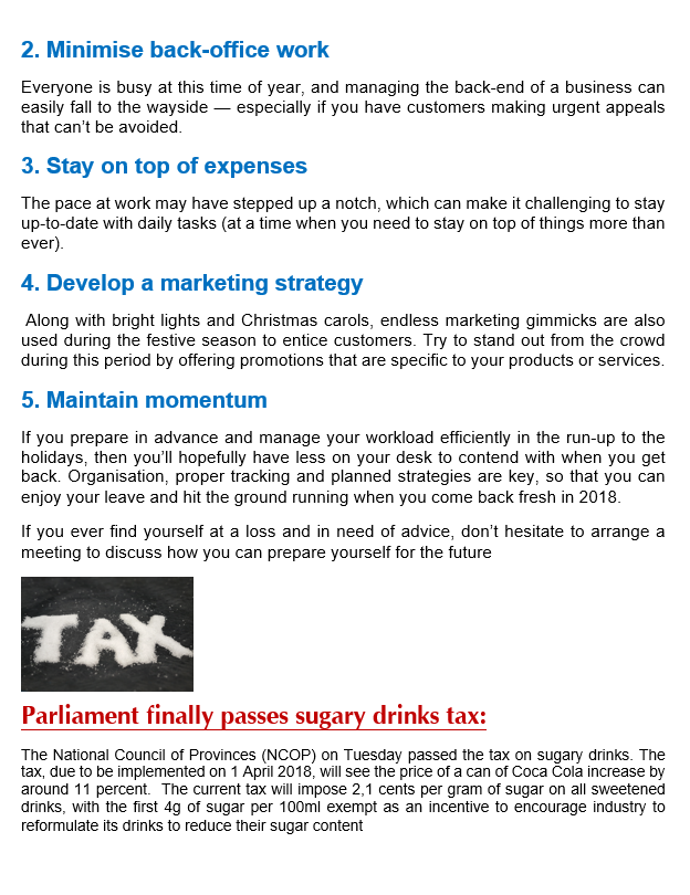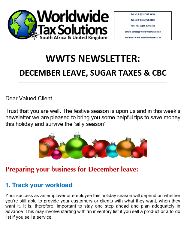 08/12/2017 | WWTS | 0 Comments | Social Media Newsletters WORLDWIDE TAX SOLUTIONS NEWSLETTER 43 (8 Dec 2017) – DECEMBER LEAVE SUGER TAXES AND CBC