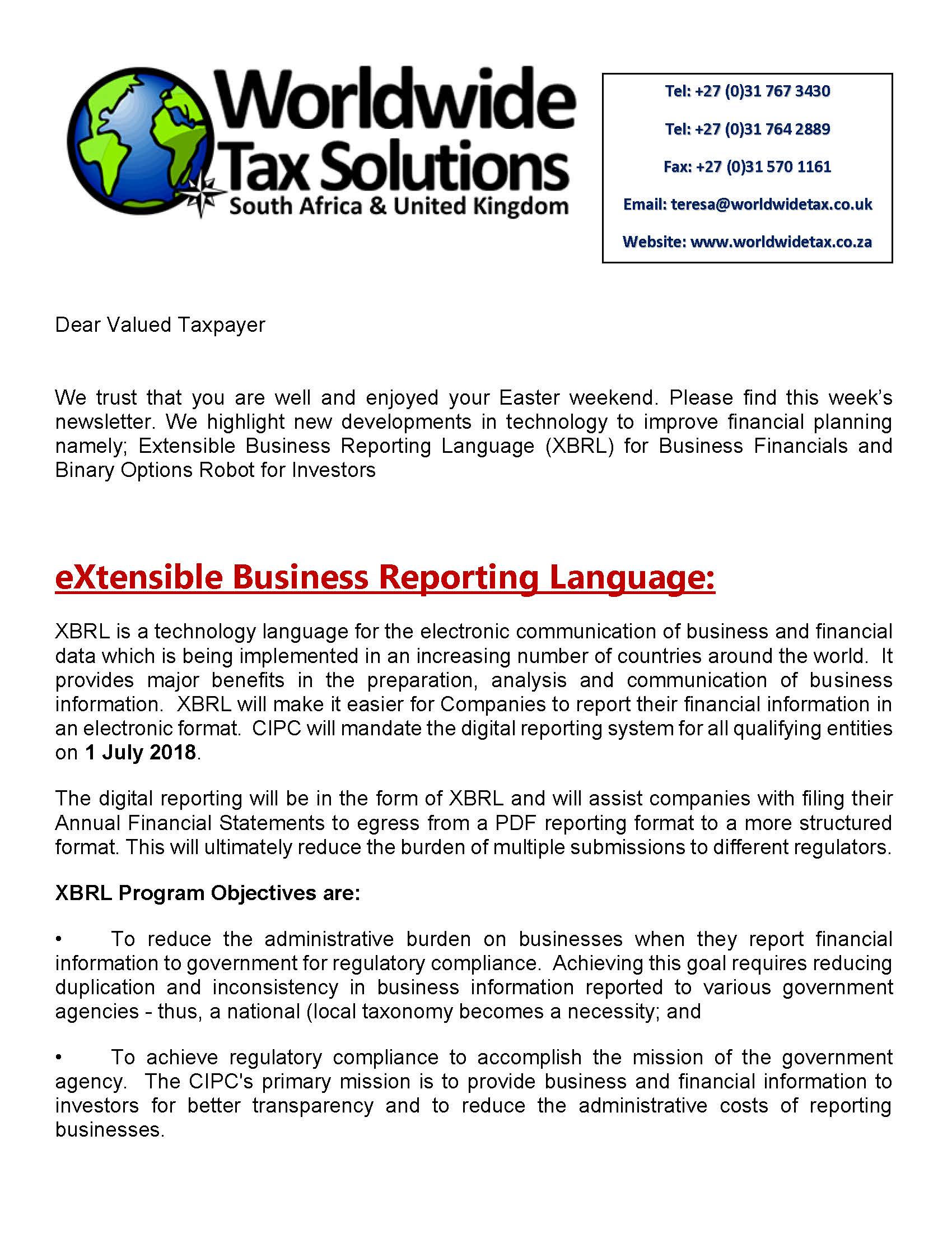 03/04/2018 | WWTS | 0 Comments | Tax Law Newsletters WORLDWIDE TAX SOLUTIONS NEWSLETTER 50 (3 April 2018) – XBRL, BINARY ROBOTS, VAT REMINDER