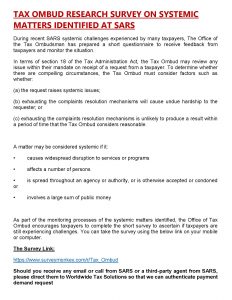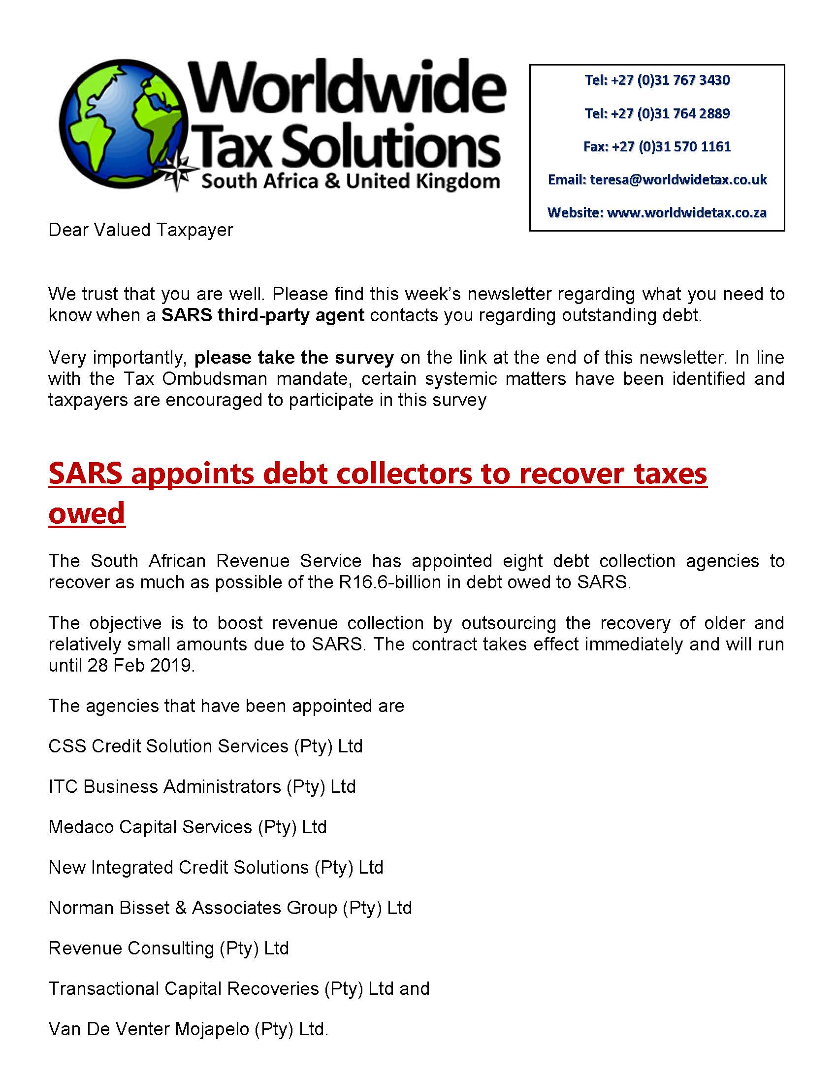 15/03/2018 | WWTS | 0 Comments | Tax Law Newsletters WORLDWIDE TAX SOLUTIONS NEWSLETTER 49 (15 Mar 2018) – SARS DEBT COLLECTION AND TAX OMBUDS INVESTIGATION