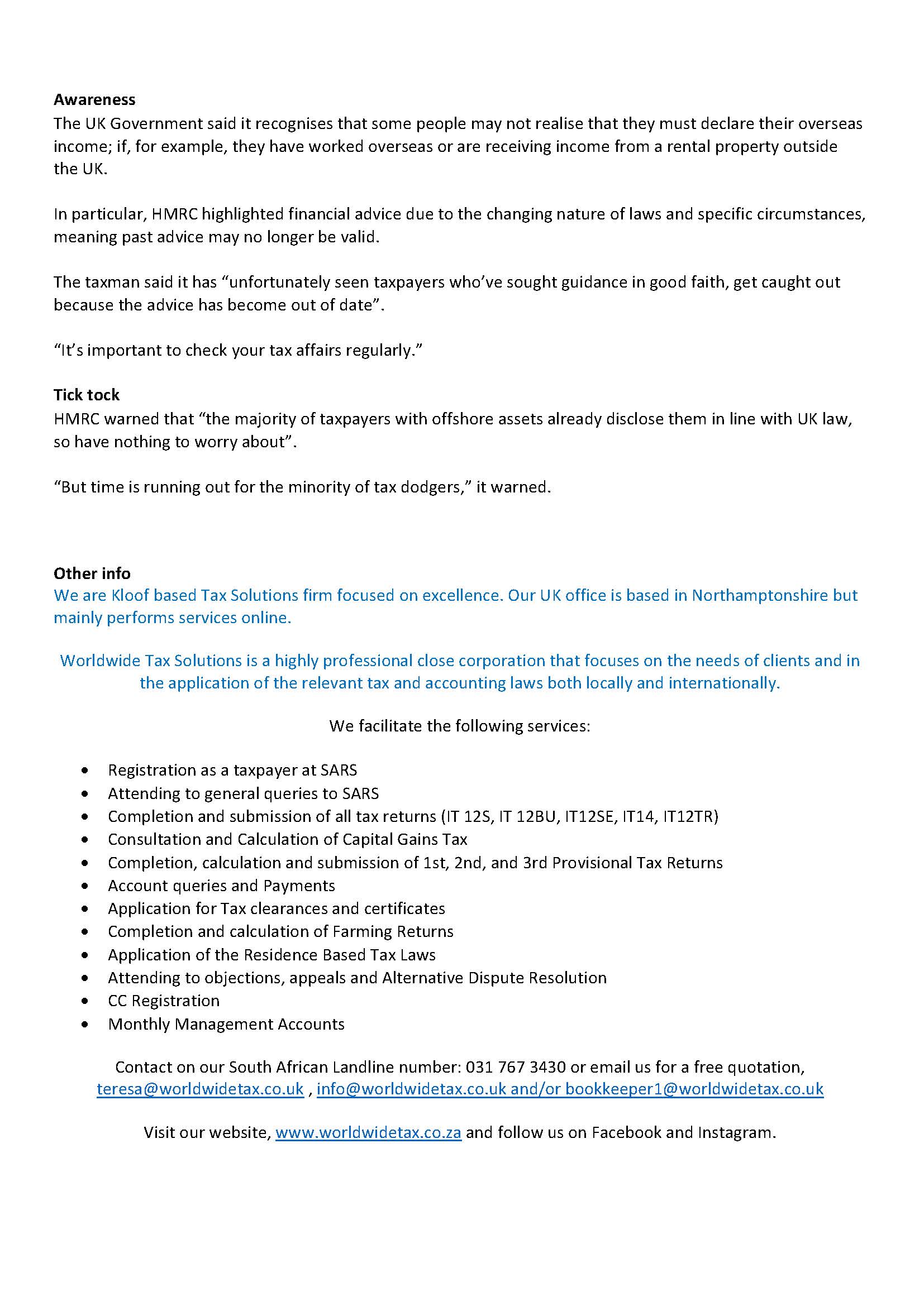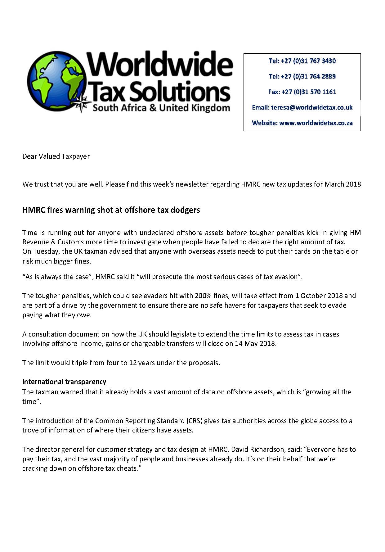 07/03/2018 | WWTS | 0 Comments | Tax Law Newsletters WORLDWIDE TAX SOLUTION NEWSLETTER 47 (7 Mar 2018) – HMRC Tax Updates