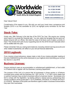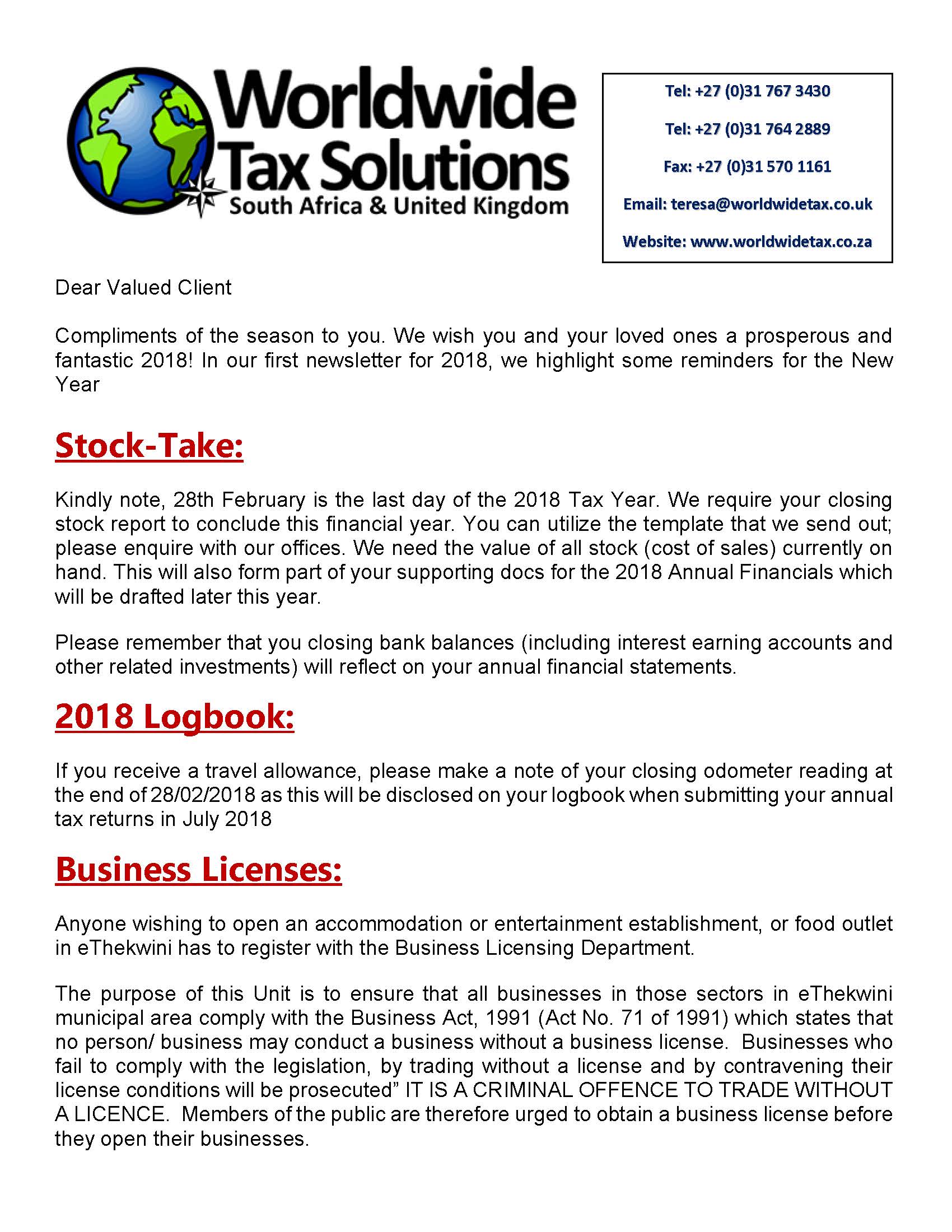 12/01/2018 | WWTS | 0 Comments | Tax Law Newsletters WORLDWIDE TAX SOLUTIONS NEWSLETTER 43 (12 Jan 2018) – 2018 REMINDERS