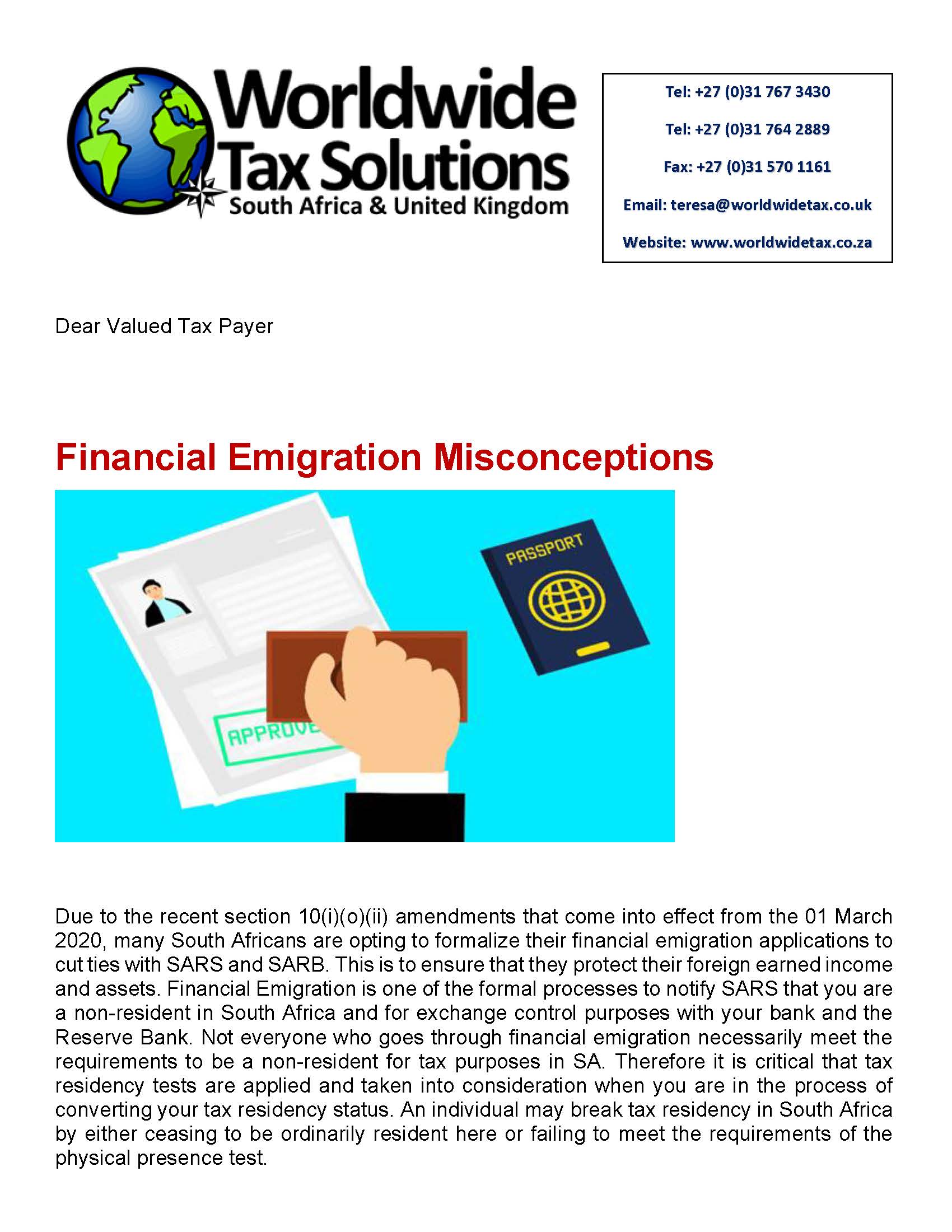 07/06/2019 | WWTS | 0 Comments | Tax Law Newsletters WORLDWIDE TAX SLOUTIONS NEWSLETTER 98 (7 Jun 2019) – FINANCIAL EMIGRATION MISCONCEPTIONS
