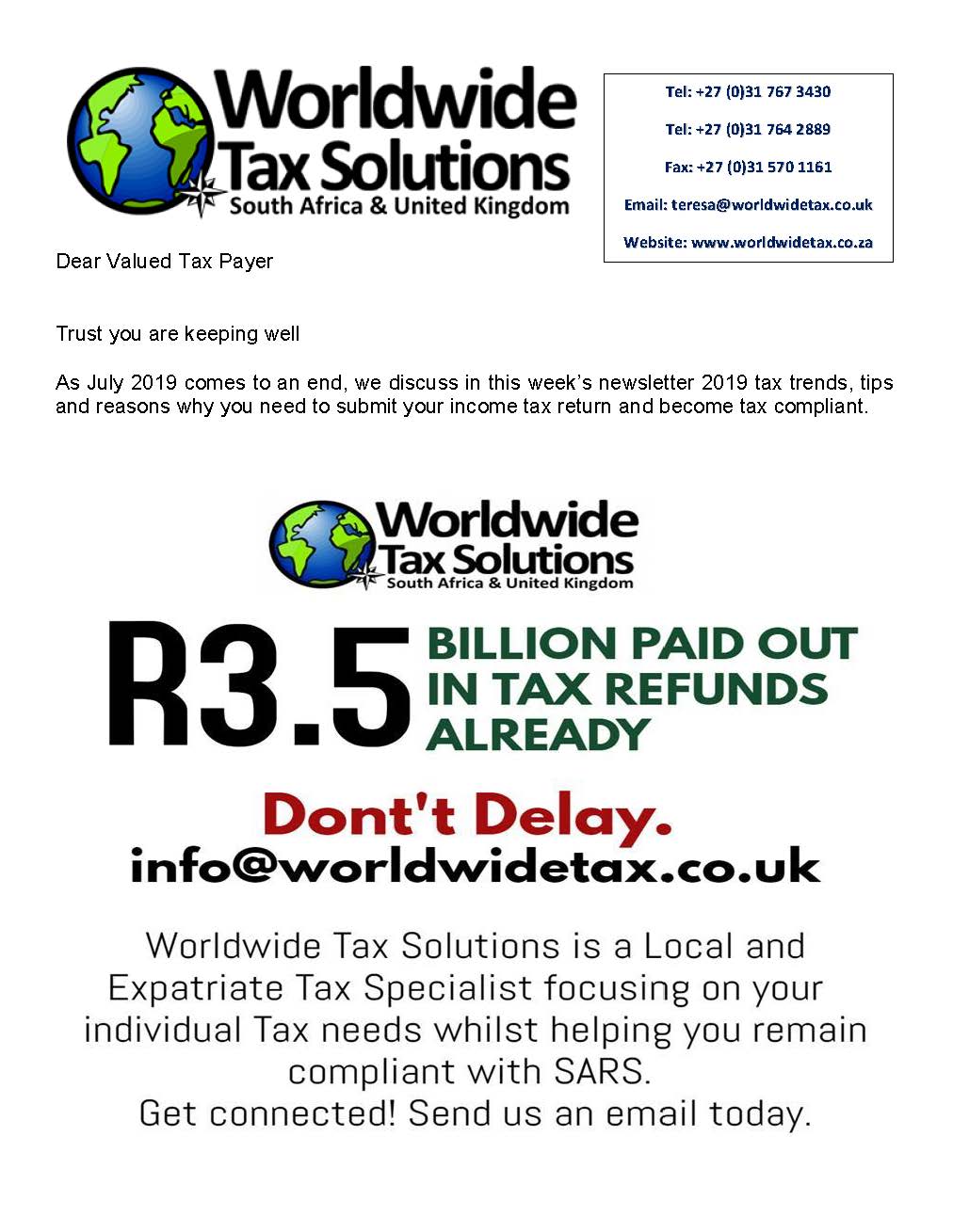 26/07/2019 | WWTS | 0 Comments | Tax Law Newsletters WORLDWIDE TAX SOLUTIONS NEWSLETTER 100 (26 July 2019) – 2019 TAX TRENDS, TRIPS AND REASONS TO SUBMIT YOUR TAX RETURN