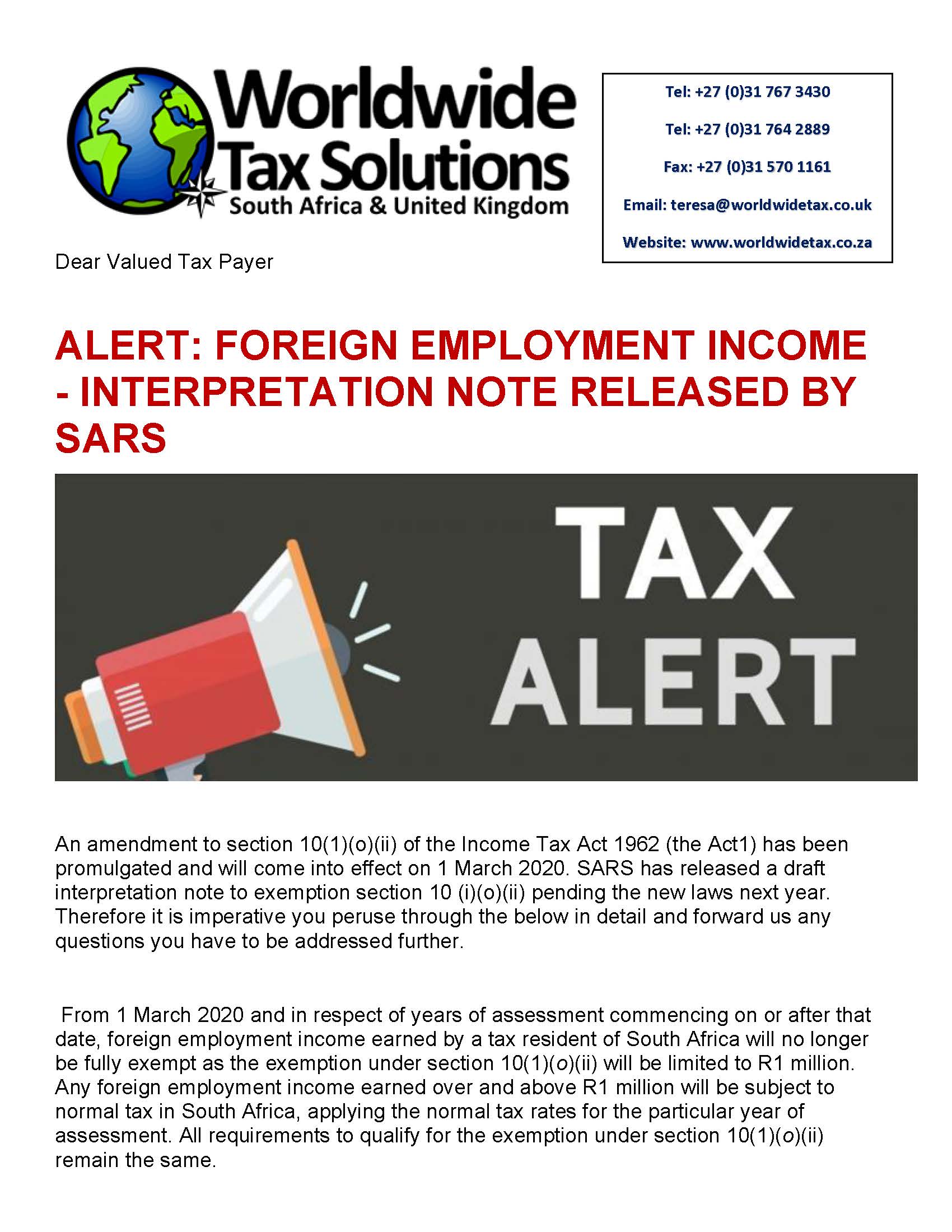 10/10/2019 | WWTS | 0 Comments | Tax Law Newsletters WORLDWIDE TAX SOLUTIONS NEWSLETTER 105 (10 Oct 2019) – ALERT: FOREIGN EMPLOYMENT INCOME – INTERPRETATION NOTE RELEASED BY SARS