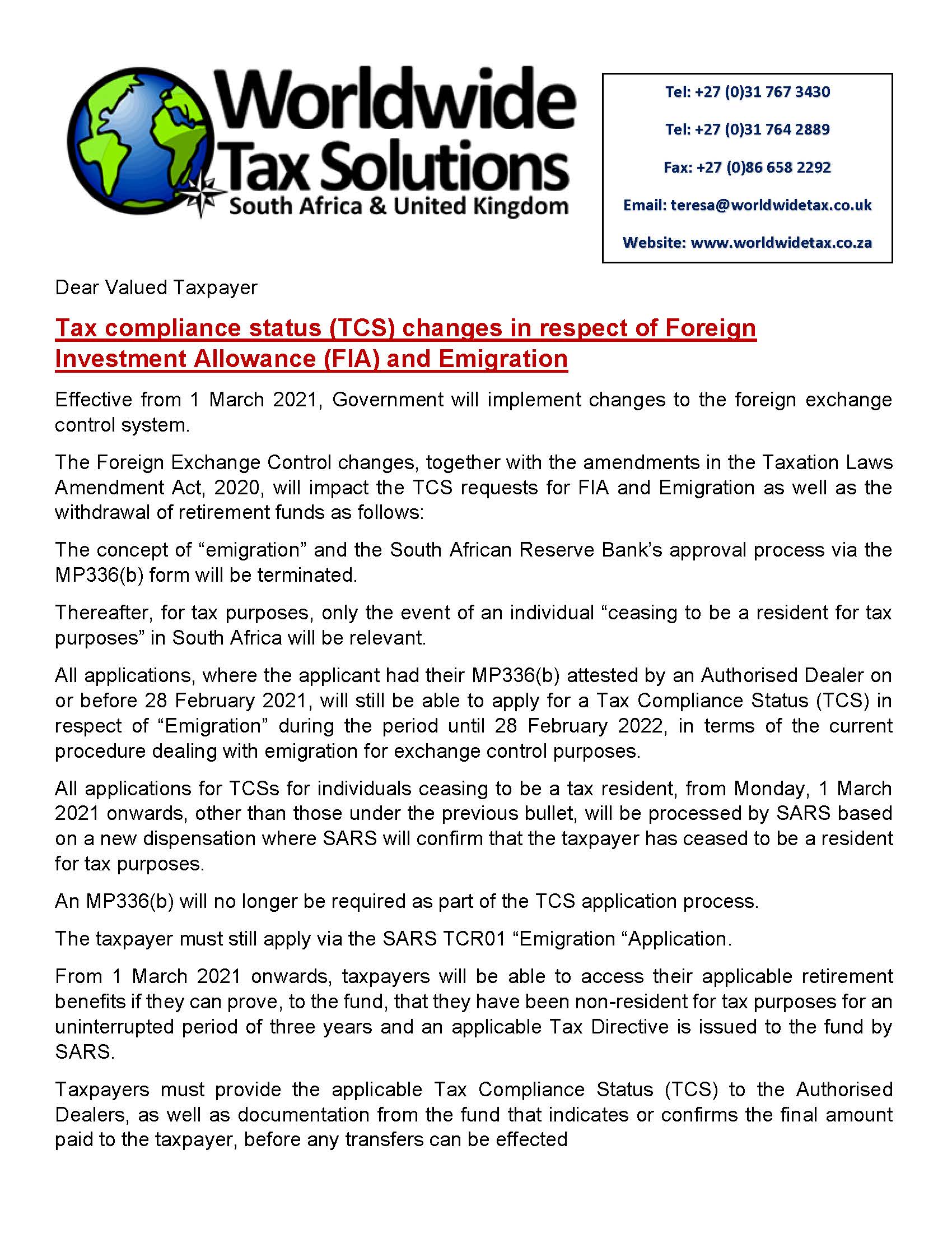 WORLDWIDE TAX SOLUTIONS NEWSLETTER 142 (2 March 2021) – Tax Compliance Status Changes