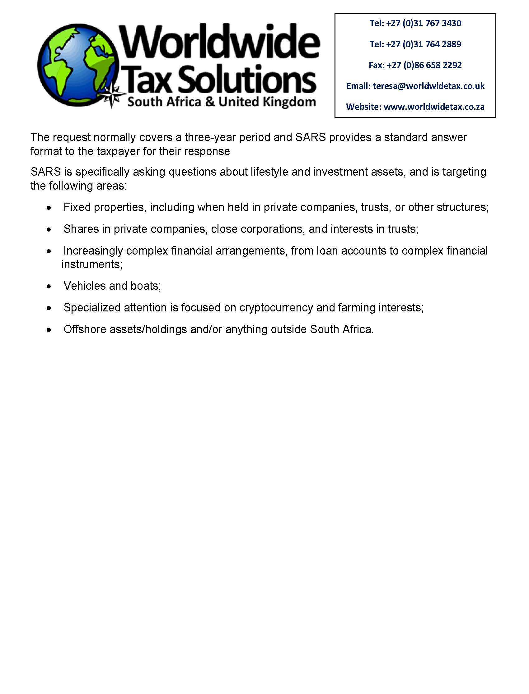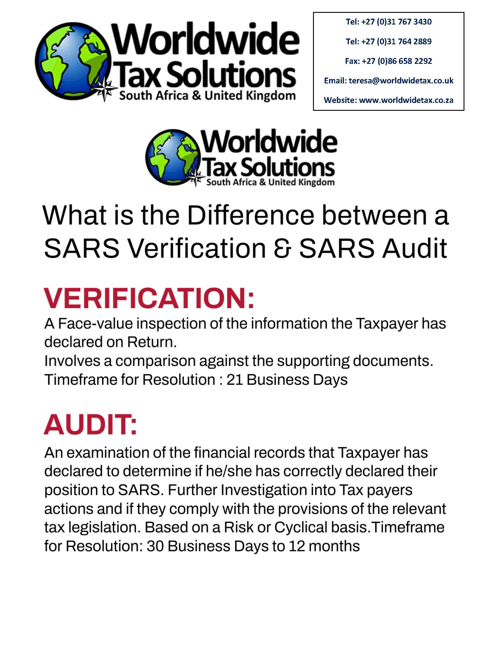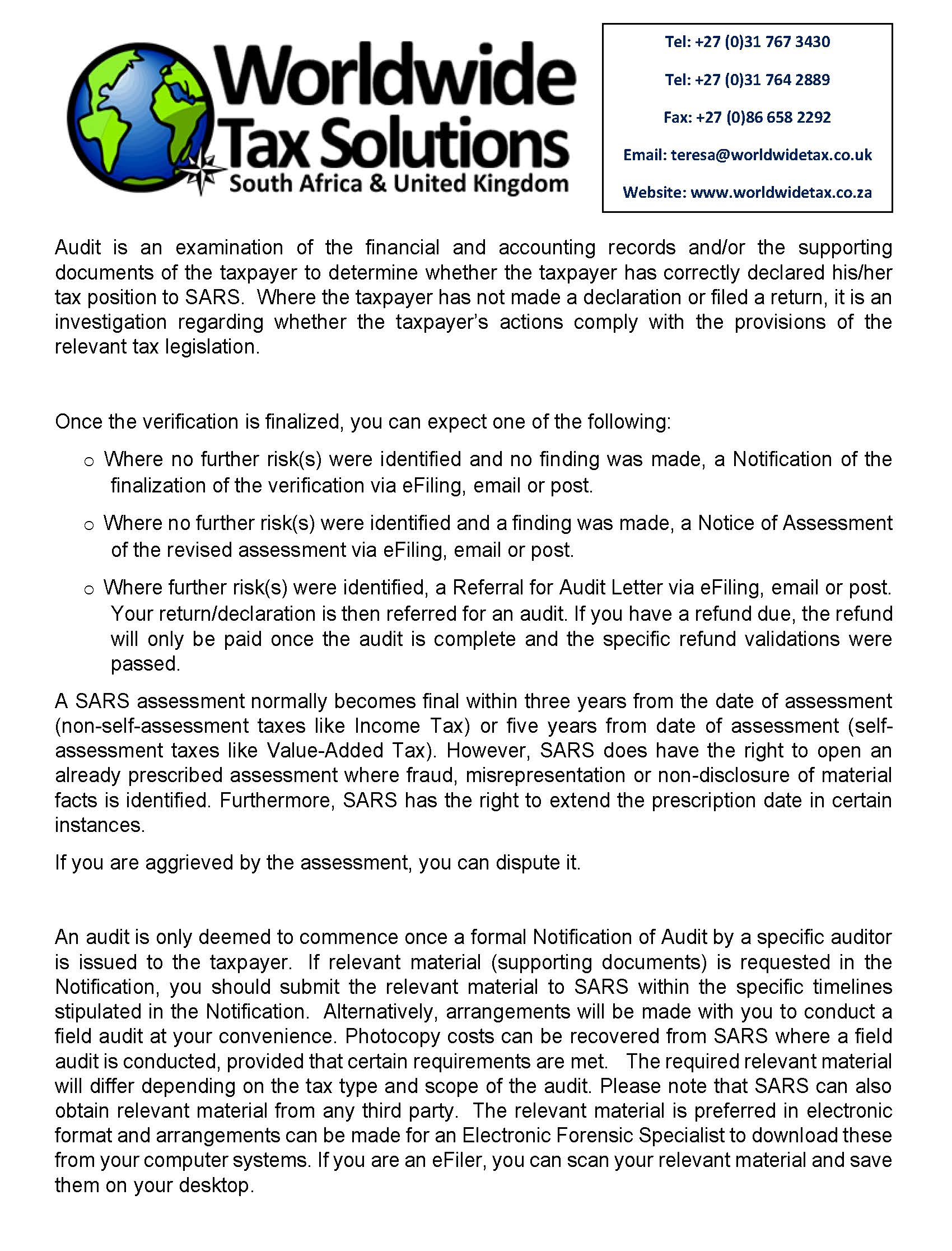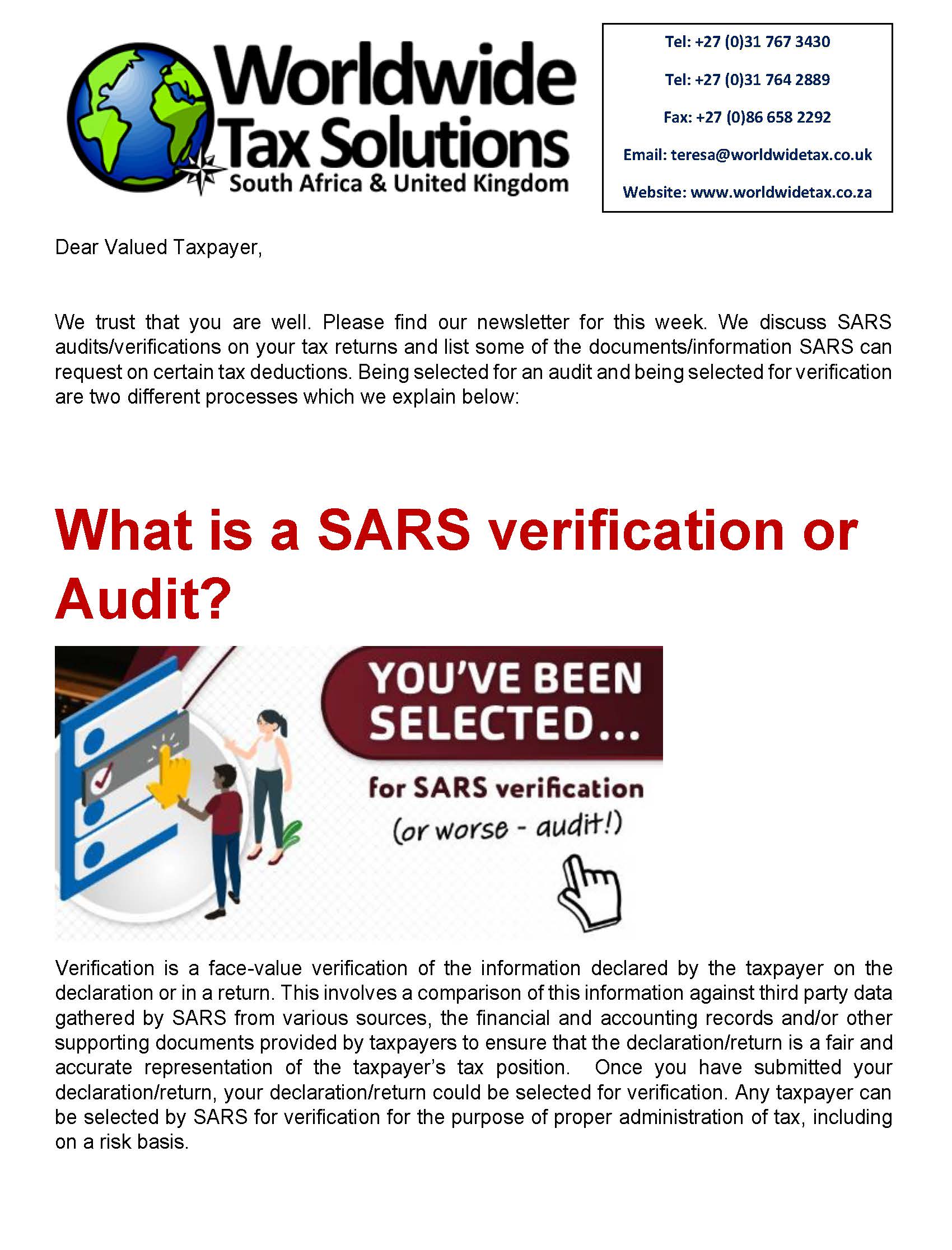 Worldwide Tax Solutions Newsletter 165 (28 July 2022) – SARS Audits and Verifications