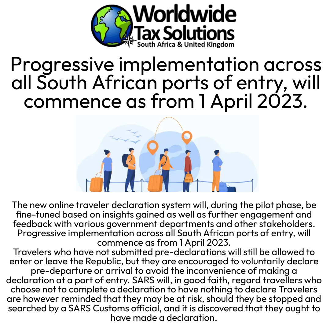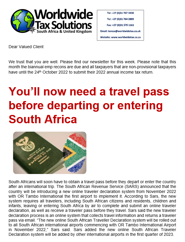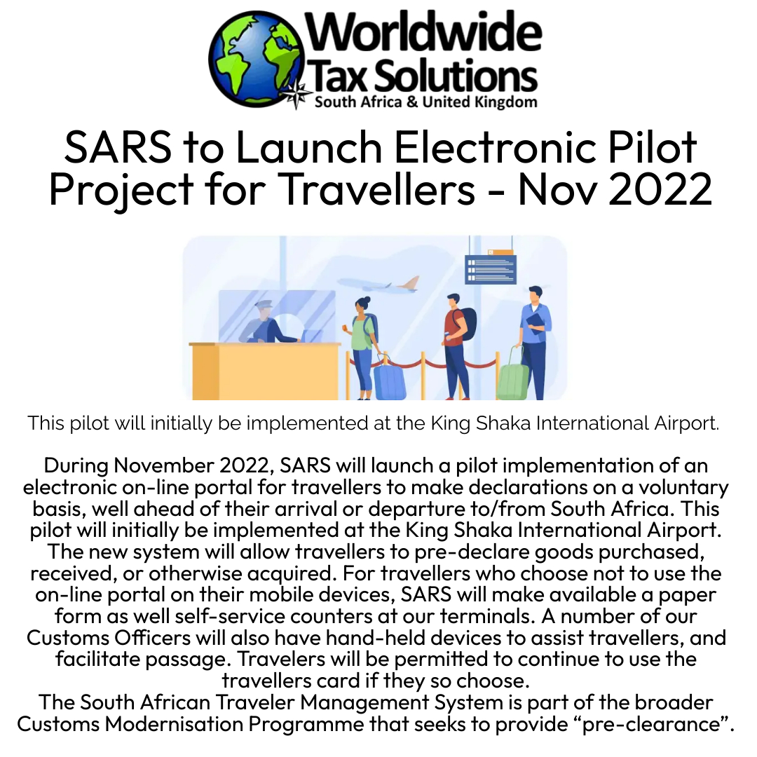 20/10/2022 | WWTS | 0 Comments | Social Media Newsletters Update: SARS to launch an electronic on-line portal for travellers to make declarations on a “voluntary basis” starting with King Shaka International Airport, in KZN.