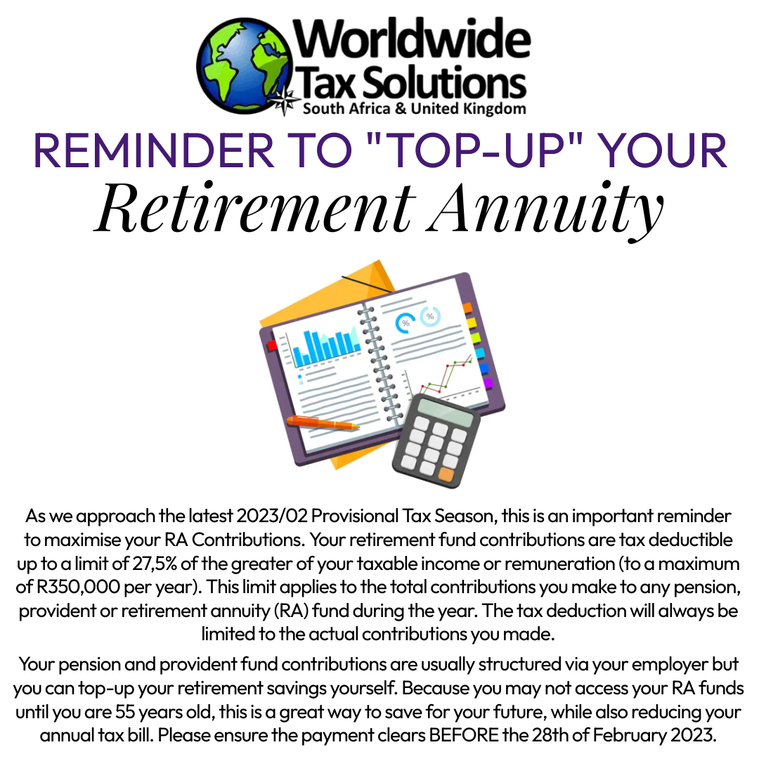24/01/2023 | WWTS | 0 Comments | Social Media Newsletters Reminder to Top-Up Your Retirement Annuity for 2023:
